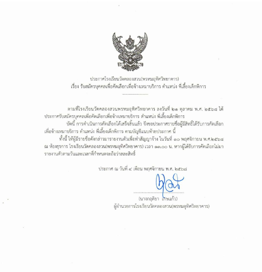 ประกาศรายชื่อผู้ที่ผ่านการคัดเลือก ตำแหน่ง พี่เลี้ยงเด็กพิการ